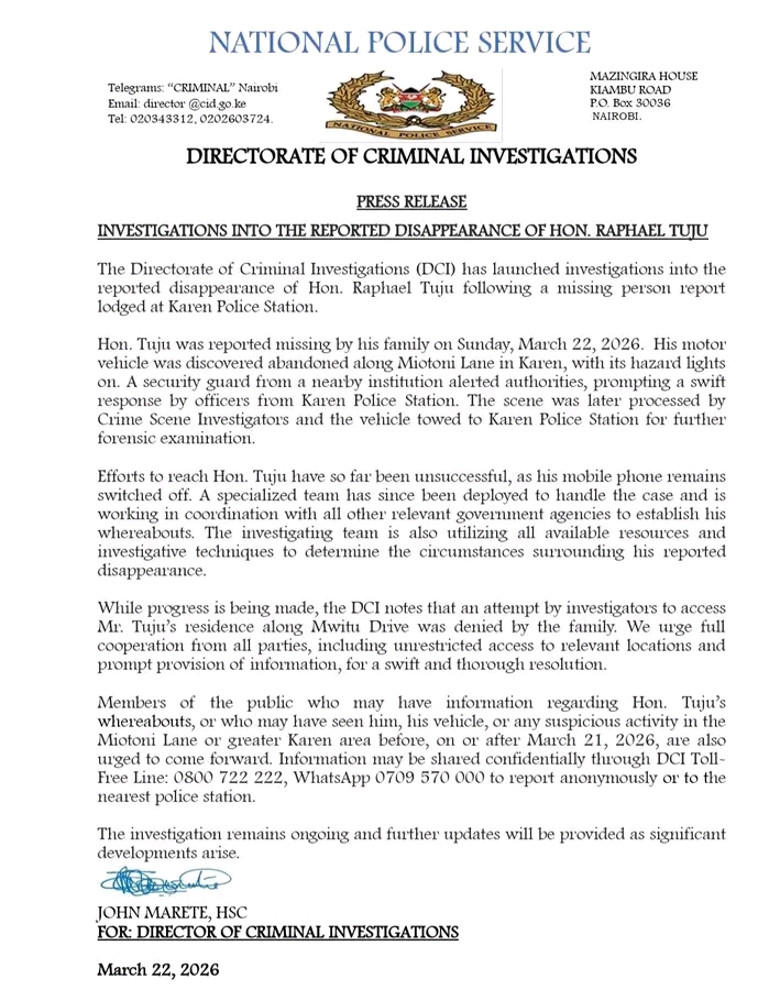 In a press statement released by the Directorate of Criminal Investigations (DCI) on Sunday, March 22, 2026, detectives revealed that Tuju was officially reported missing by his family earlier that day, triggering immediate concern within security circles and the public.