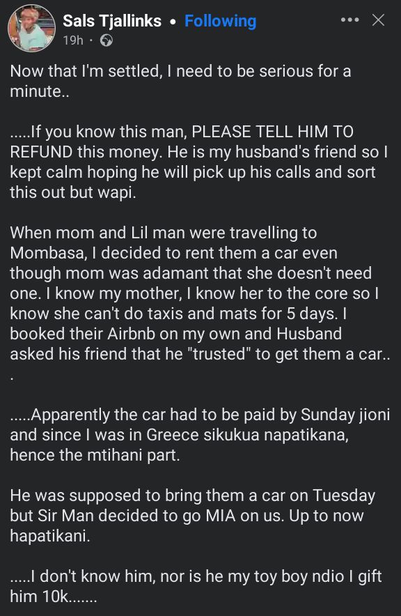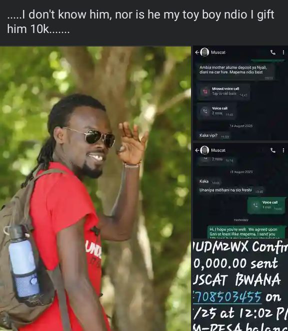 …..I don’t know him, nor is he my toy boy ndio I gift him 10k…….”Sals Tjallinks wrote.