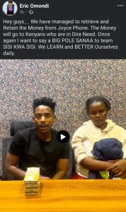 “Hey guys… We have managed to retrieve and Retain the Money from Joyce Phone. The Money will go to Kenyans who are in Dire Need. Once again I want to say a BIG POLE SANAA to team SISI KWA SISI. We LEARN and BETTER Ourselves daily,” he said.