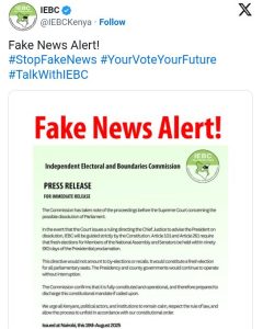 IEBC, through an official statement issued on Wednesday, August 20, 2025, denied the claims holding that the initial press release is fake news as it urged members of the public not to engage in spreading the same.