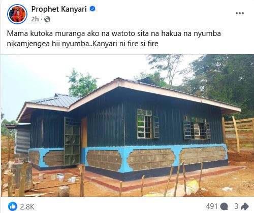 “Mama kutoka muranga ako na watoto sita na hakua na nyumba nikamjengea hii nyumba..Kanyari ni fire si fire,” Kanyari wrote.