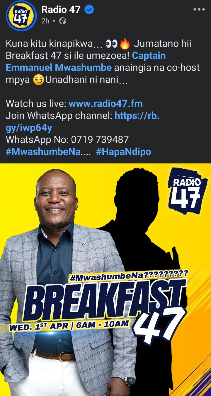 The buzz began after the station revealed that Emmanuel Mwashumbe will be hosting the popular Breakfast 47 show alongside a new, yet-to-be-unveiled co-host.