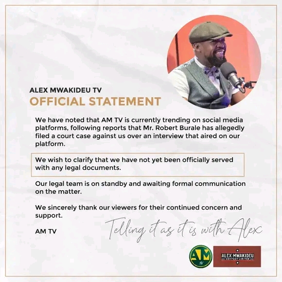 “We have noted that AM TV is currently trending on social media platforms, following reports that Mr Robert Burale has allegedly filed a court case against us over an interview that aired in our platform. We wish to clarify that we have not yet been officially served with any legal documents,” the statement read in part.