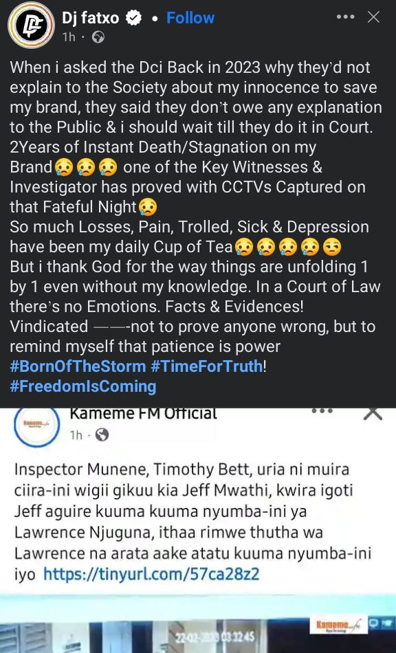 Following the revelations in court, DJ Fatxo took to social media on Friday, October 24, to express frustration that the DCI has yet to publicly clear his name despite the emerging evidence.