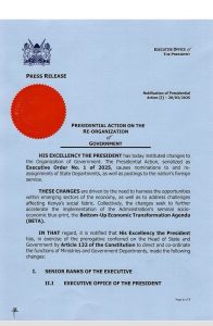 A statement signed by Head of Public Service Felix Koskei said Professor Edward Kisiang’ani was demoted and appointed as senior advisor and member of the President’s Council of Economic Advisors.