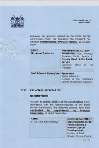 Amos Gathecha was promoted from Principal Secretary of Public Service to Deputy Head of Public Service at the Executive Office of the President.