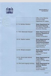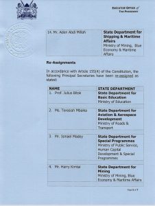 Education PS Belio Kipsang was moved to the State Department for Immigration and Citizen Services at the Interior Ministry swapping positions with Julius Bitok while Medical Services PS Harry Kimtai was now moved to the Mining Ministry.