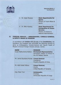 Ruto has nominated the following persons to serve as Ambassadors, Consuls-General and Deputy Heads of Mission in Kenya’s foreign missions abroad, namely