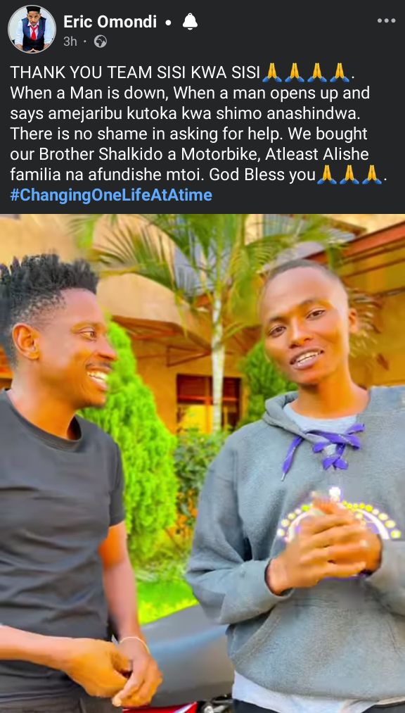 “We used the contributions from Sisi kwa Sisi to buy Shalkido a brand-new motorbike. It is registered under his official name, with the logbook and insurance already processed. The tank is full, and we even did some shopping for him and his family,” Eric said.