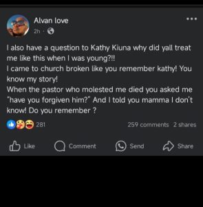Former TPF Contestant and content creator Alvan Love has levelled grave accusations against JCC head, Reverend Kathy Kiuna, dragging her into a web of child abuse and sexual exploitation at the church.