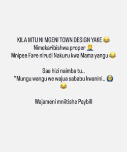 “Kila mtu ni mgeni town design yake. Nimekaribishiwa proper. Mnipee fare nirudi Nakuru kwa mama yangu. Sawa hizi naomba tu; ‘Mungu wangu we jua sababu kwa nini’. Wajameni mniitishe Paybill,” Kabugi wrote.