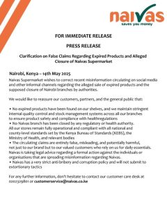 “Naivas maintains stringent internal quality control and stock management systems across all our branches to ensure product safety and compliance with health regulations.”