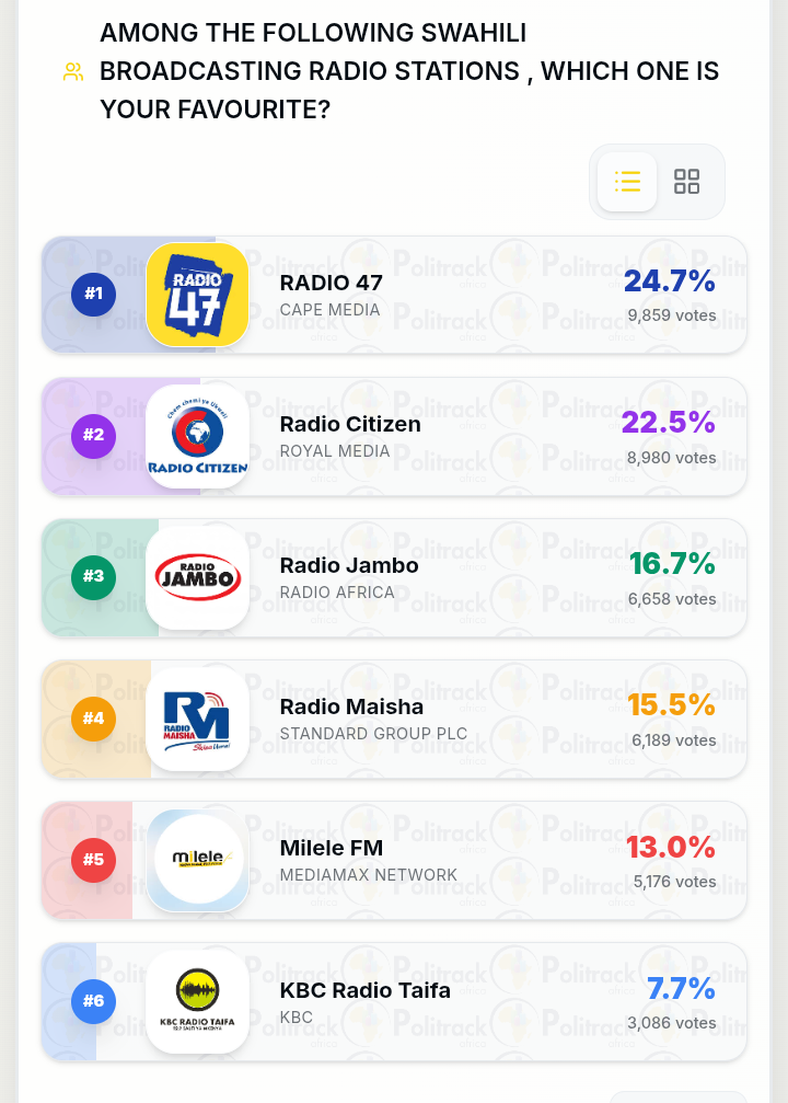 Radio 47 has been ranked the most listened-to Swahili radio station in Kenya in 2026, according to the latest audience poll conducted by Politrack Africa.